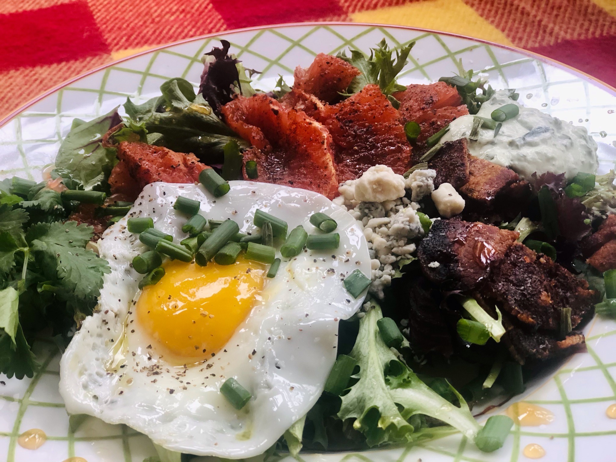 Assemble greens on 2 plates, add broiled grapefruit sections, bacon, blue cheese, egg to each plate. Drizzle with Olive Oil, Honey and garnish with chopped green onions and Lime/Cilantro Yogurt or Aoli. Best served with grapefruit and eggs warm.